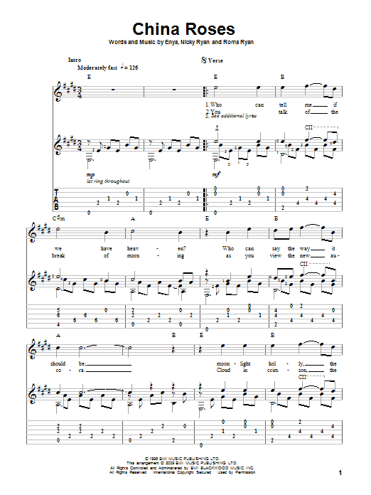 Enya China Roses sheet music, chords, lyrics - Printable PDF for Guitar Tab