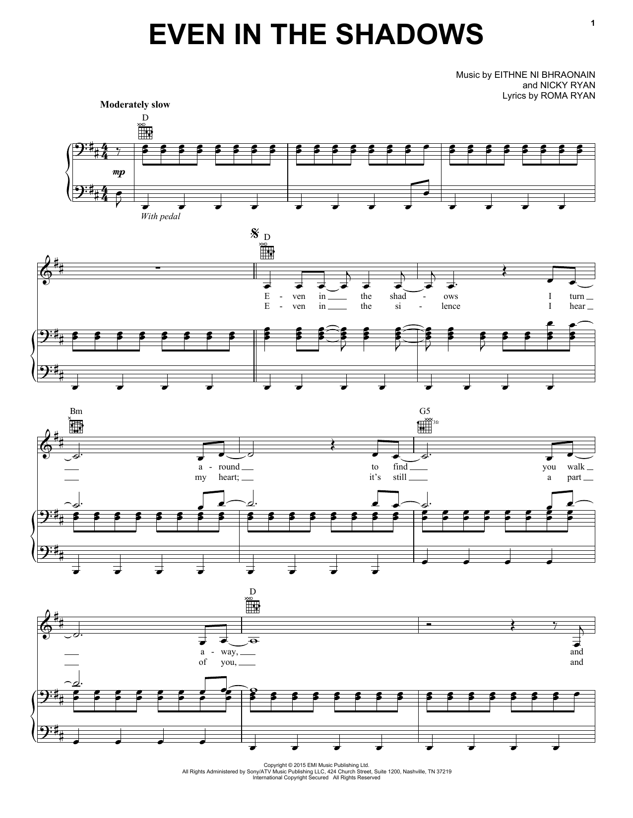 Enya Even In The Shadows sheet music, chords, lyrics - Printable PDF for Piano, Vocal & Guitar (Right-Hand Melody)