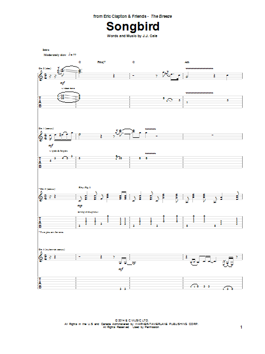 Download Eric Clapton Songbird sheet music and printable PDF notes for Guitar Tab. This score composition includes 9 page(s). It was wonderfuly put together for the style of Blues with catalog SKU number of 157331. Popular song was originally published on 2014-12-22T00:00:00 and was updated on 2021-11-27T00:00:00. The arrangement code for Eric Clapton sheet music is TAB and minimum required purchase quantaty of the digital score is 1. Learn more about Eric Clapton and click here ».
