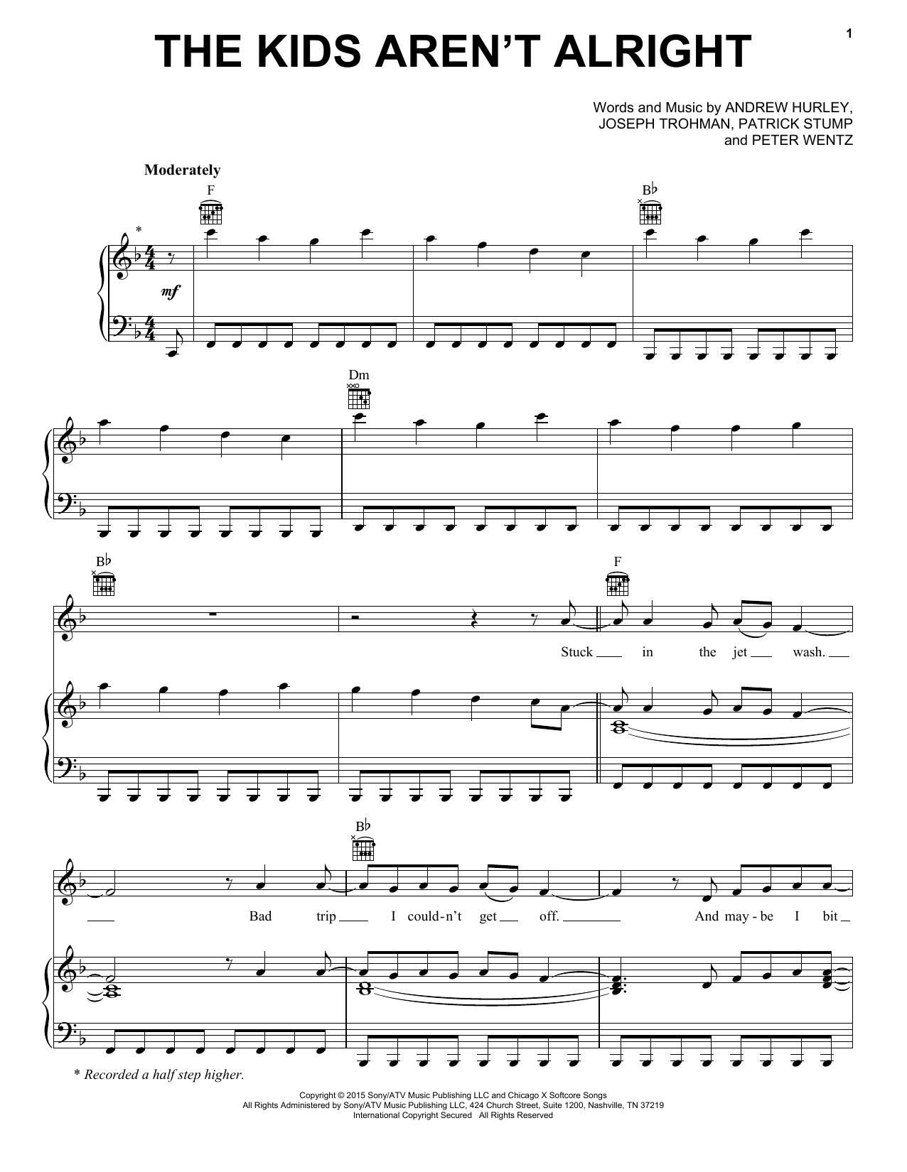 Fall Out Boy The Kids Aren't Alright sheet music, chords, lyrics - Printable PDF for Piano, Vocal & Guitar (Right-Hand Melody)