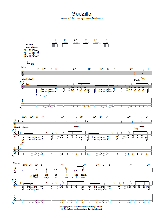 Feeder Godzilla sheet music, chords, lyrics - Printable PDF for Guitar Tab