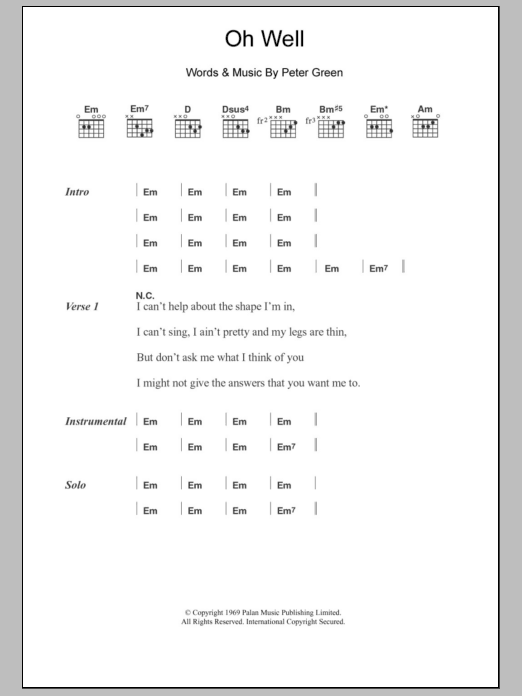 Fleetwood Mac Oh Well sheet music, chords, lyrics - Printable PDF for Lyrics & Chords