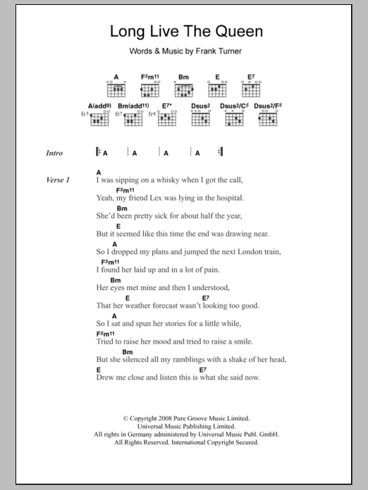 Frank Turner Long Live The Queen sheet music, chords, lyrics - Printable PDF for Lyrics & Chords