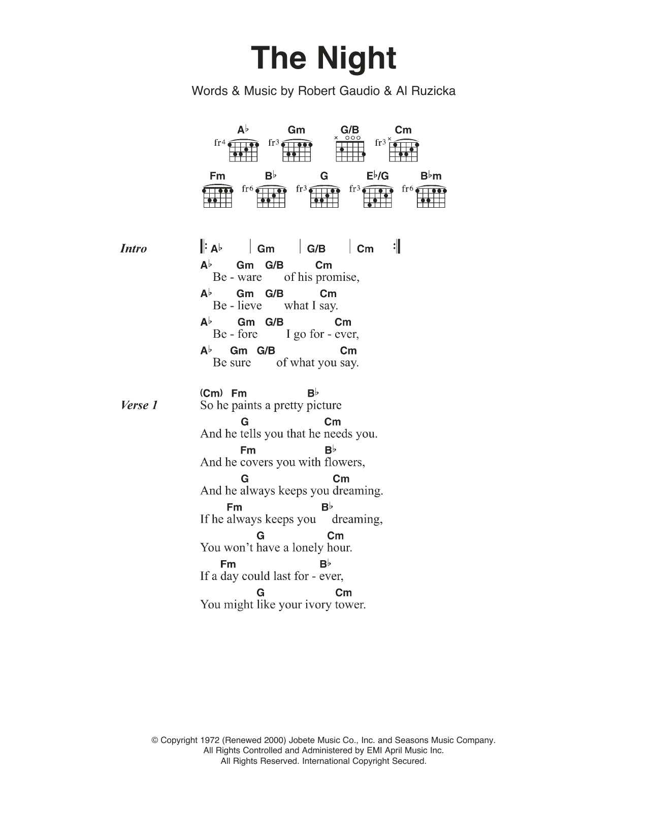 Frankie Valli & The Four Seasons The Night sheet music, chords, lyrics - Printable PDF for Lyrics & Chords