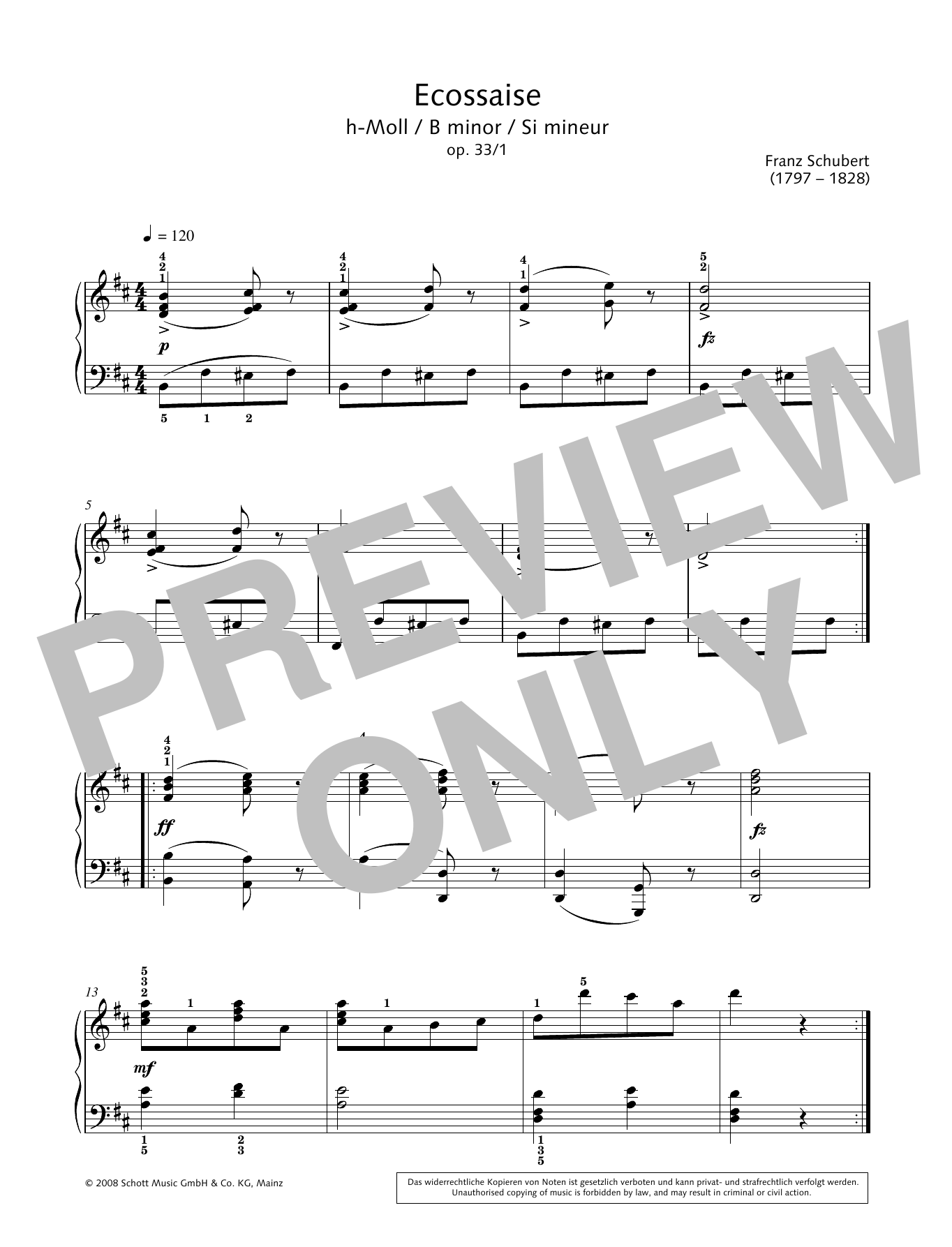 Franz Schubert Ecossaise in B minor sheet music, chords, lyrics - Printable PDF for Piano Solo