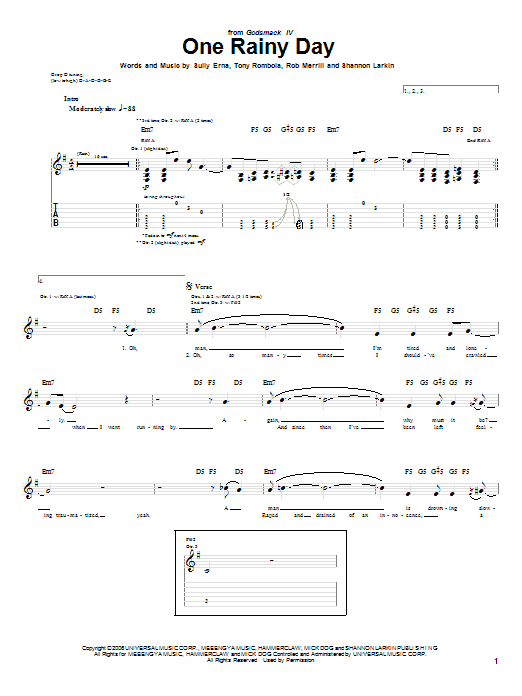 Godsmack One Rainy Day sheet music, chords, lyrics - Printable PDF for Guitar Tab
