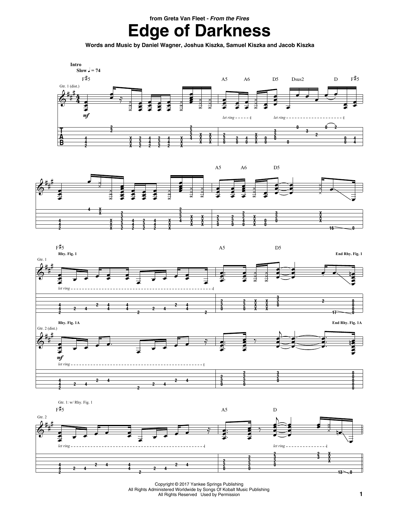 Greta Van Fleet Edge Of Darkness sheet music, chords, lyrics - Printable PDF for Guitar Tab