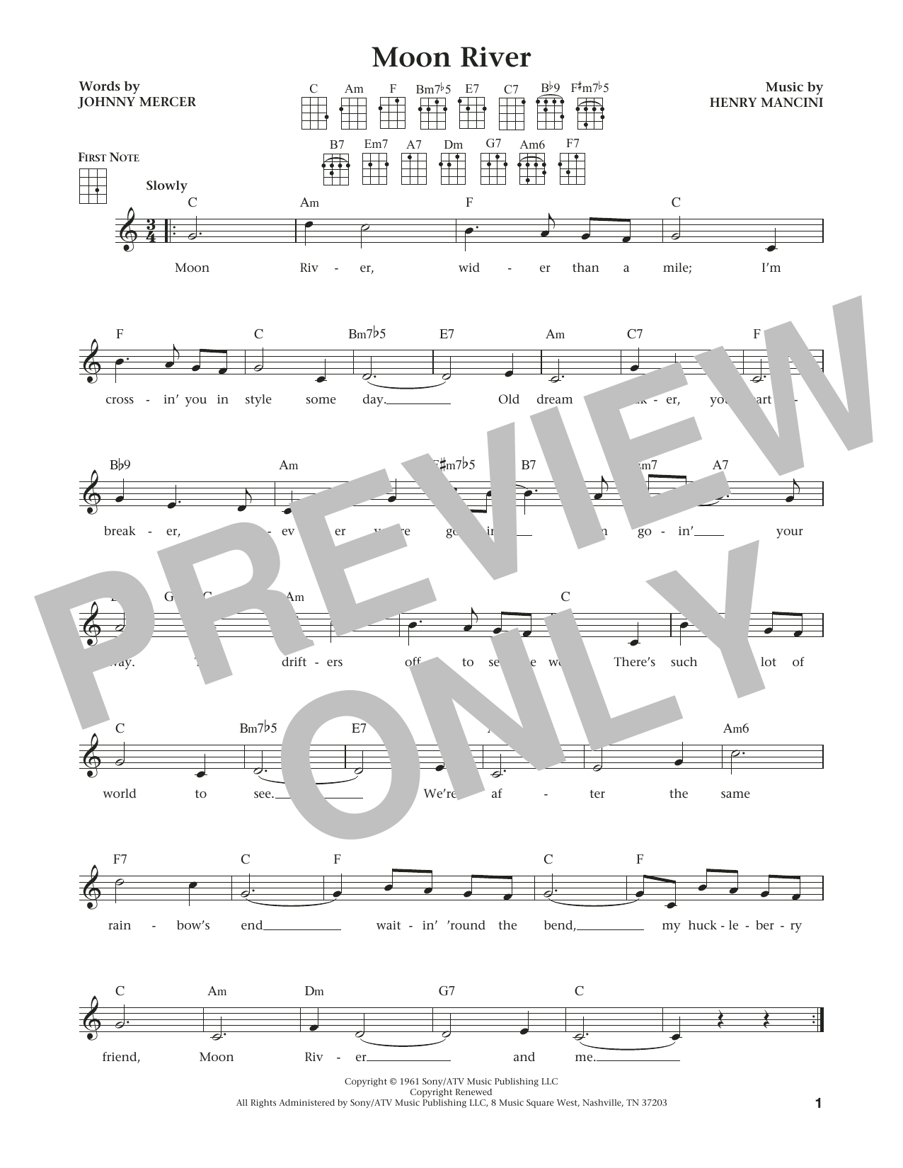 Henry Mancini Moon River sheet music, chords, lyrics - Printable PDF for Ukulele