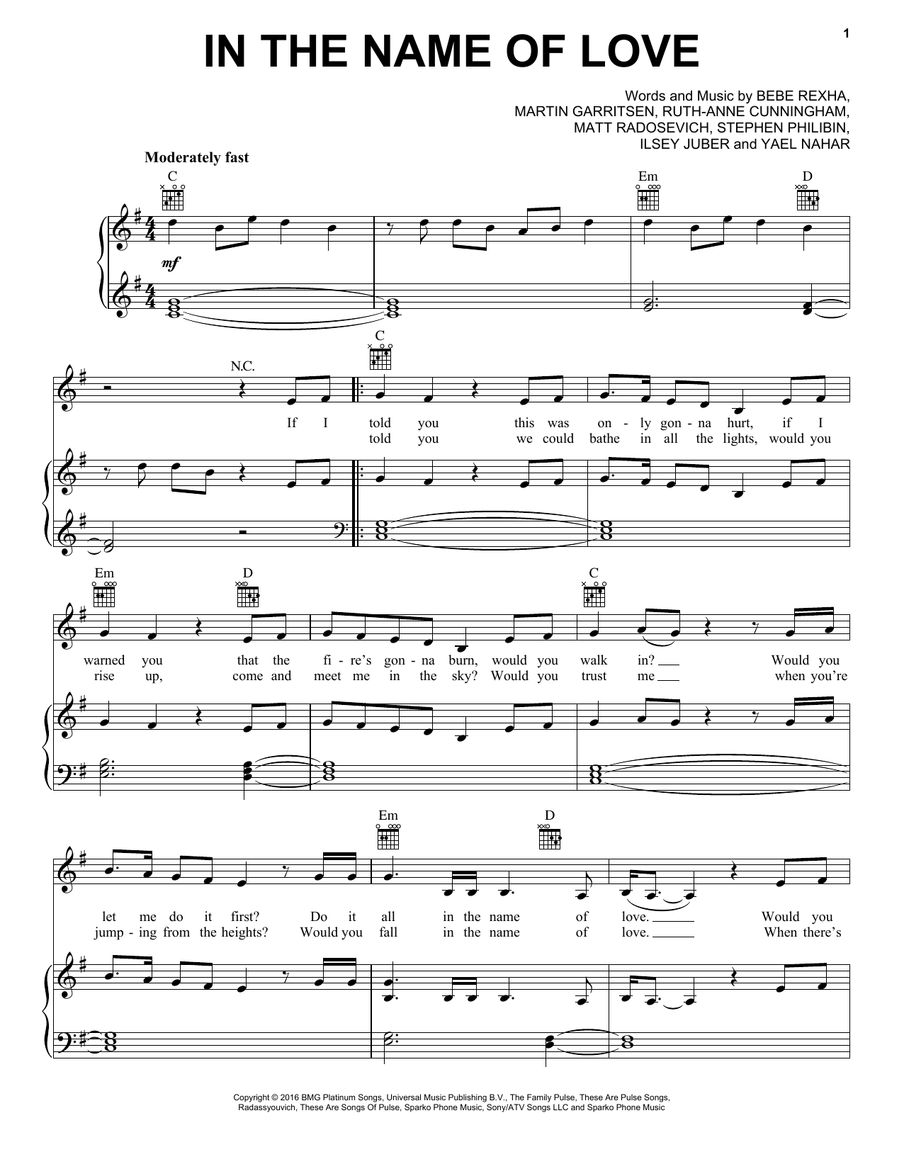 Martin Garrix & Bebe Rexha In The Name Of Love sheet music, chords, lyrics - Printable PDF for Piano, Vocal & Guitar (Right-Hand Melody)
