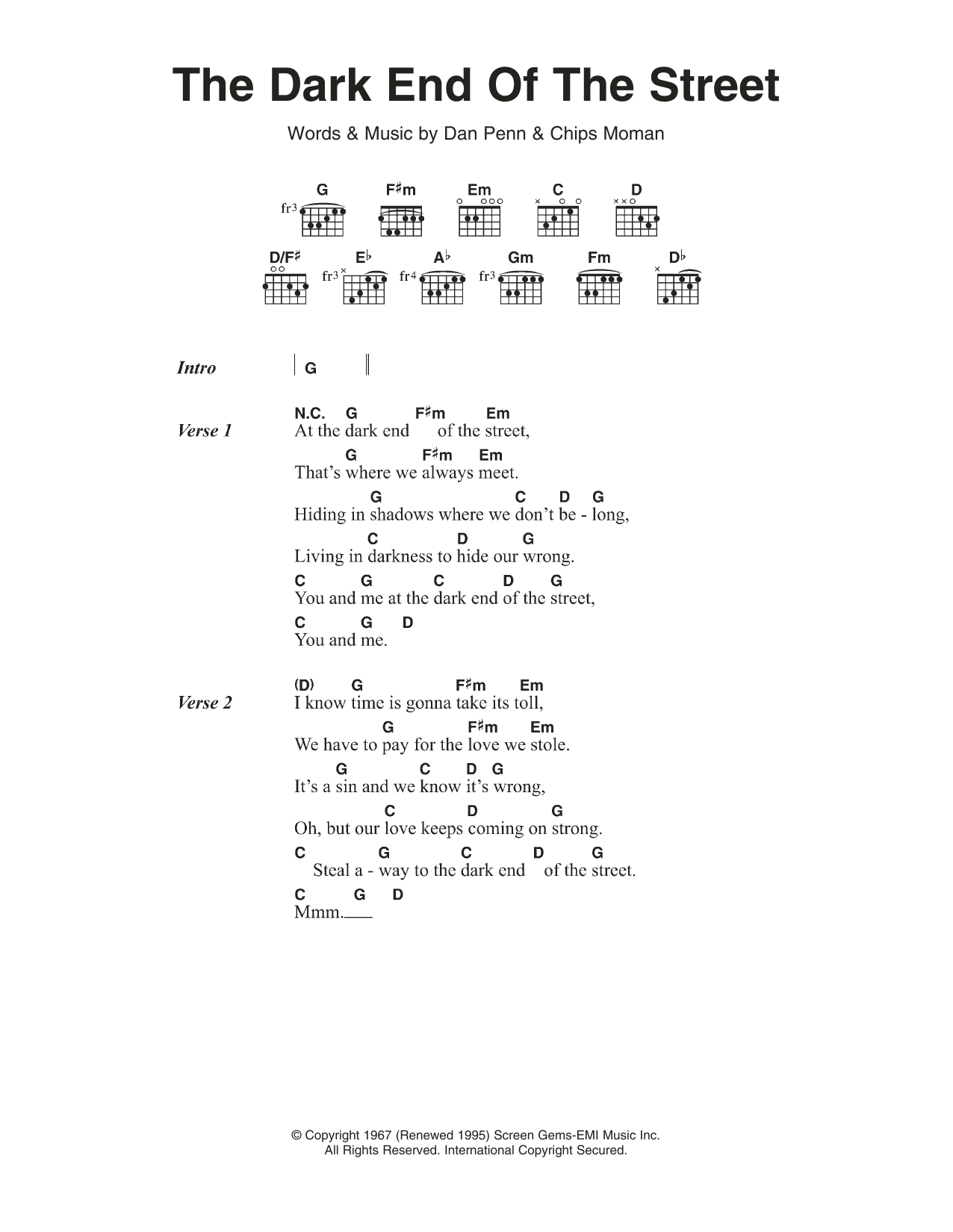 James Carr The Dark End Of The Street sheet music, chords, lyrics - Printable PDF for Lyrics & Chords