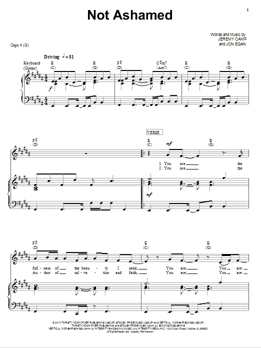 Jeremy Camp Not Ashamed sheet music, chords, lyrics - Printable PDF for Piano, Vocal & Guitar (Right-Hand Melody)