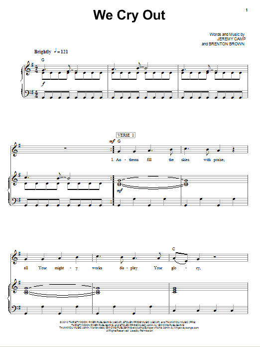 Download Jeremy Camp We Cry Out sheet music and printable PDF notes for Piano, Vocal & Guitar Chords (Right-Hand Melody). This score composition includes 7 page(s). It was wonderfuly put together for the style of Christian with catalog SKU number of 76304. Popular song was originally published on 2010-09-28T00:00:00 and was updated on 2022-03-19T00:00:00. The arrangement code for Jeremy Camp sheet music is PVGRHM and minimum required purchase quantaty of the digital score is 1. Learn more about Jeremy Camp and click here ».