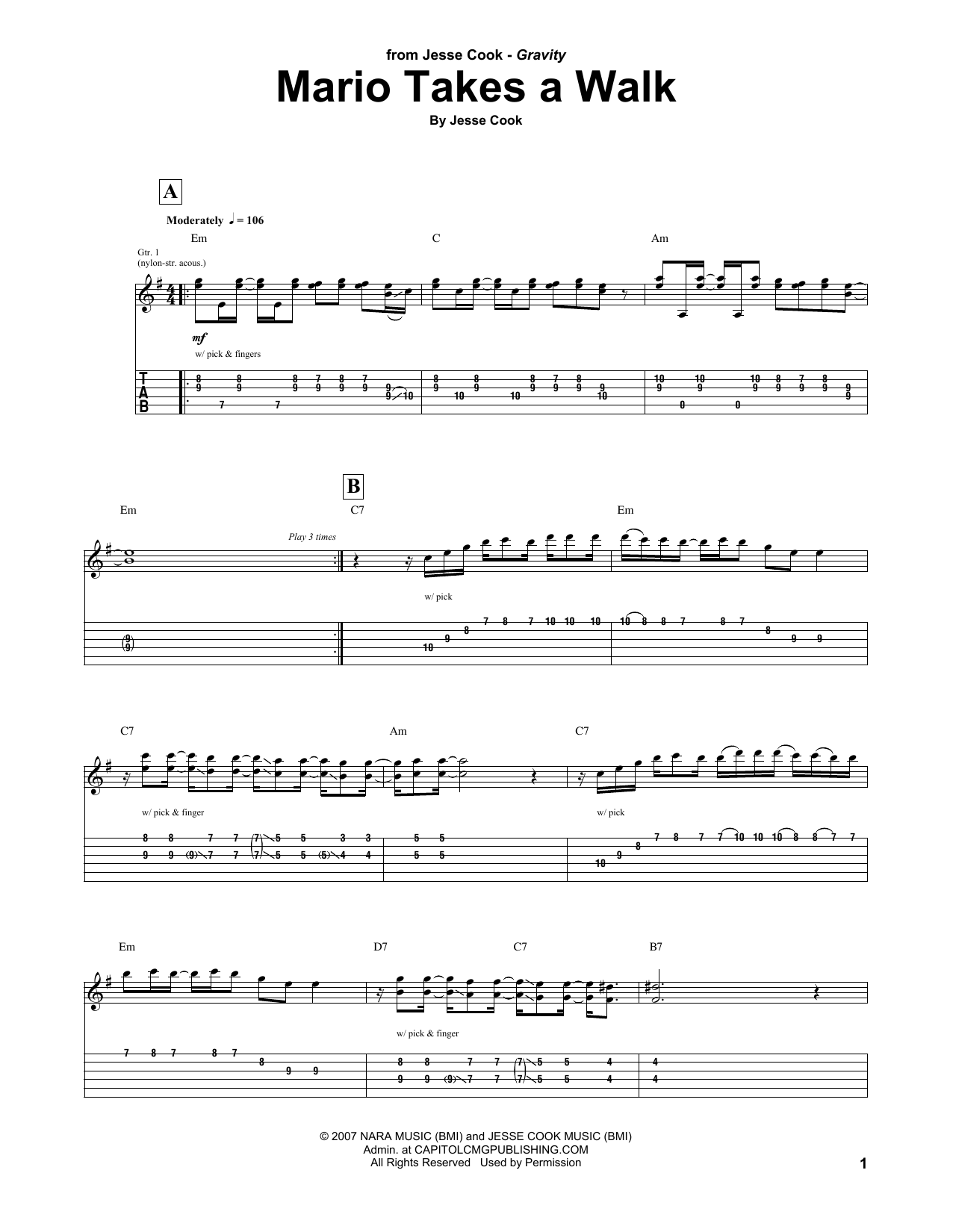Jesse Cook Mario Takes A Walk sheet music, chords, lyrics - Printable PDF for Guitar Tab
