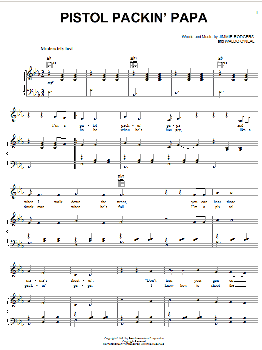 Jimmie Rodgers Pistol Packin' Papa sheet music, chords, lyrics - Printable PDF for Piano, Vocal & Guitar (Right-Hand Melody)