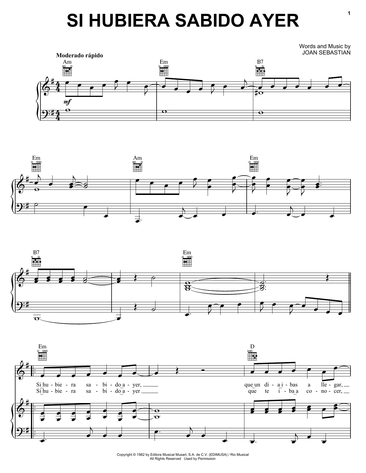 Joan Sebastian Si Hubiera Sabido Ayer sheet music, chords, lyrics - Printable PDF for Piano, Vocal & Guitar (Right-Hand Melody)