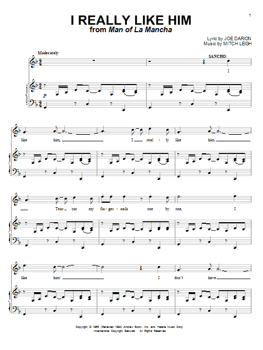 * Please, make sure you check if transposition is possible before your complete your online purchase. You do that by clicking the "notes" icon at the bottom of the interactive viewer. If transposition is available, then various semitones transposition options will appear. If not, the notes icon will remain grayed. Most of our scores are traponsosable, but not all of them.So, check if Joe Darion I Really Like Him Sheet Music is indeed transposable before completing your online purchase!