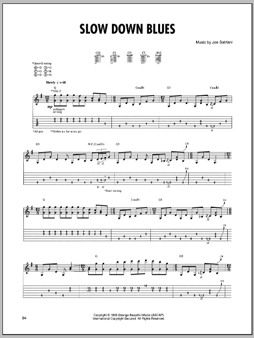 Joe Satriani Slow Down Blues sheet music, chords, lyrics - Printable PDF for Guitar Tab