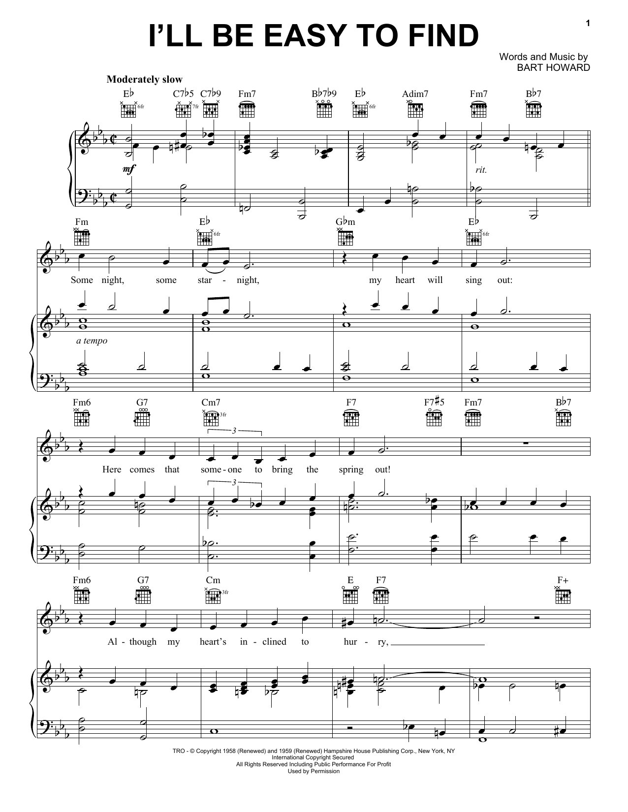 Johnny Mathis I'll Be Easy To Find sheet music, chords, lyrics - Printable PDF for Piano, Vocal & Guitar (Right-Hand Melody)
