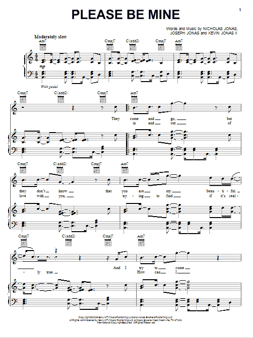 Jonas Brothers Please Be Mine sheet music, chords, lyrics - Printable PDF for Piano, Vocal & Guitar (Right-Hand Melody)