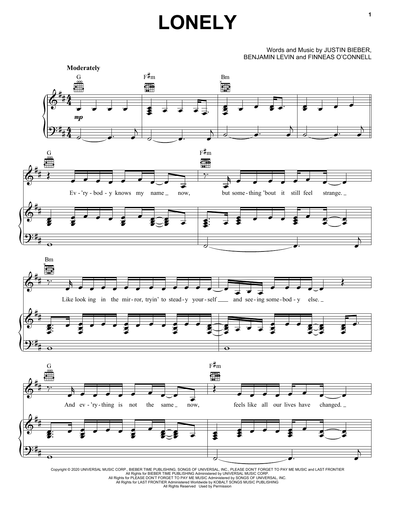 Justin Bieber Lonely (with benny blanco) sheet music, chords, lyrics - Printable PDF for Piano, Vocal & Guitar (Right-Hand Melody)