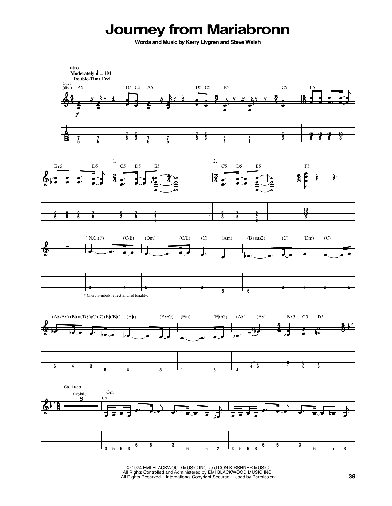 Kansas "Journey From Mariabronn" Sheet Music