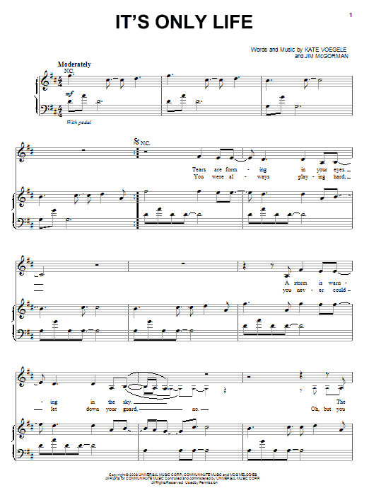 Kate Voegele It's Only Life sheet music, chords, lyrics - Printable PDF for Piano, Vocal & Guitar (Right-Hand Melody)