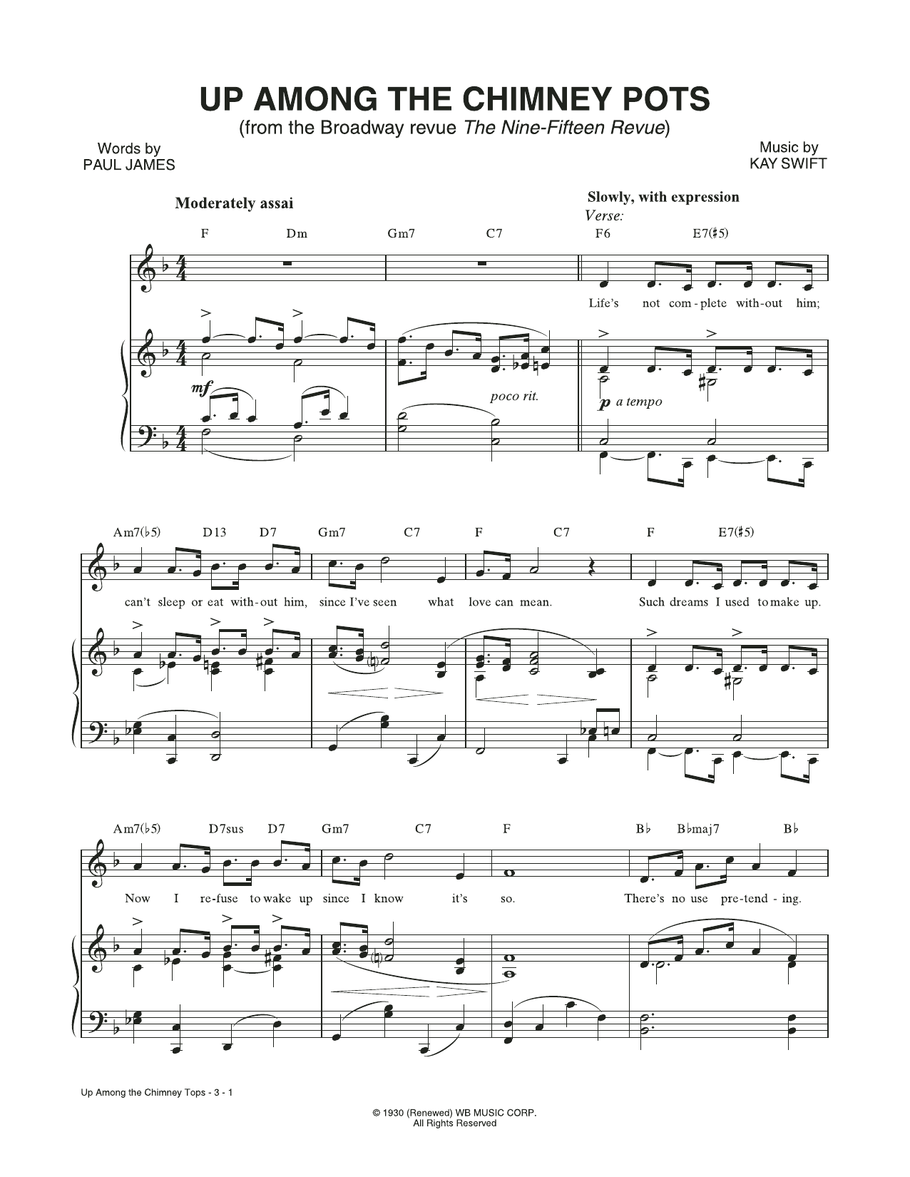 Kay Swift & Paul James Up Among The Chimney Pots (from The Nine-Fifteen Revue) sheet music, chords, lyrics - Printable PDF for Piano & Vocal