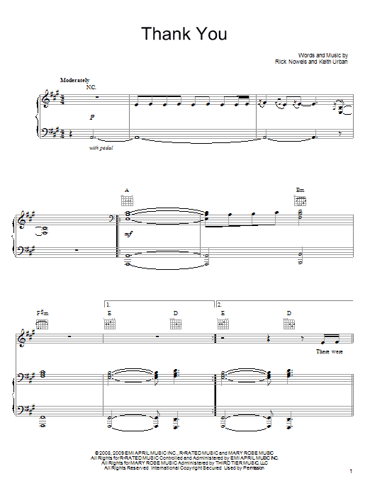 Keith Urban Thank You sheet music, chords, lyrics - Printable PDF for Piano, Vocal & Guitar (Right-Hand Melody)