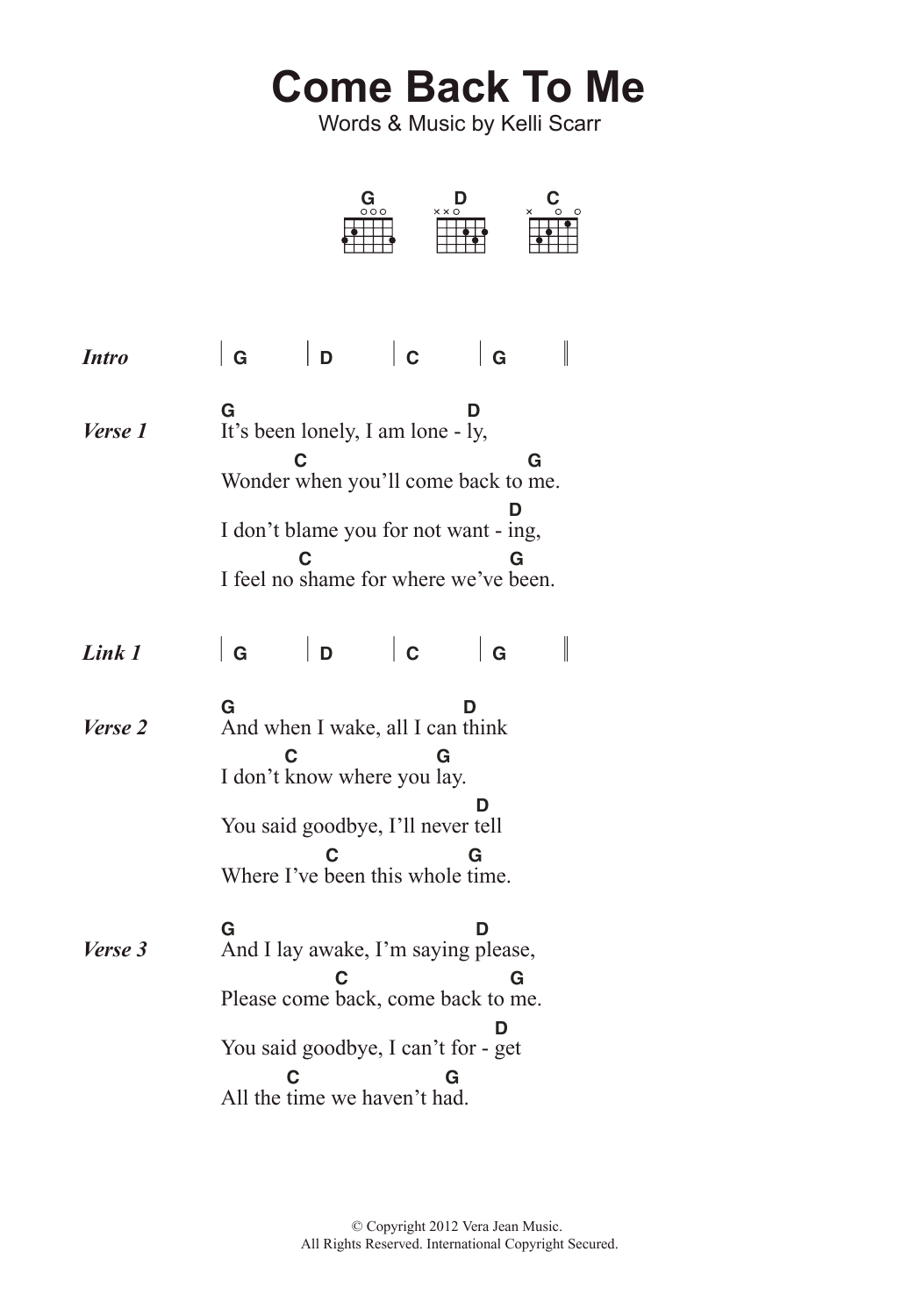 Kelli Scarr Come Back To Me sheet music, chords, lyrics - Printable PDF for Lyrics & Chords