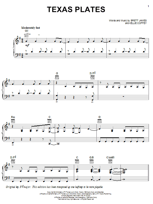 Kellie Coffey Texas Plates sheet music, chords, lyrics - Printable PDF for Piano, Vocal & Guitar (Right-Hand Melody)