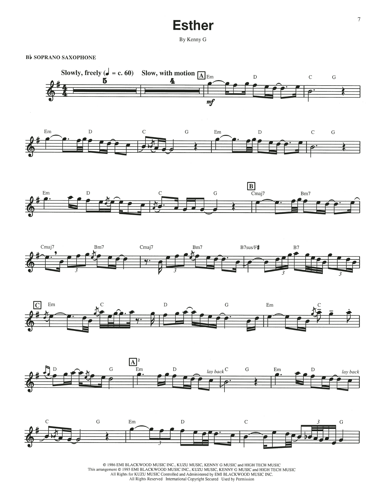 Kenny G Esther sheet music, chords, lyrics - Printable PDF for Soprano Sax Transcription