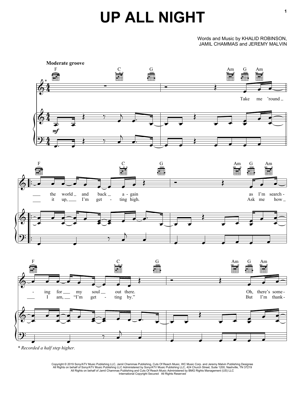Khalid Up All Night sheet music, chords, lyrics - Printable PDF for Piano, Vocal & Guitar (Right-Hand Melody)