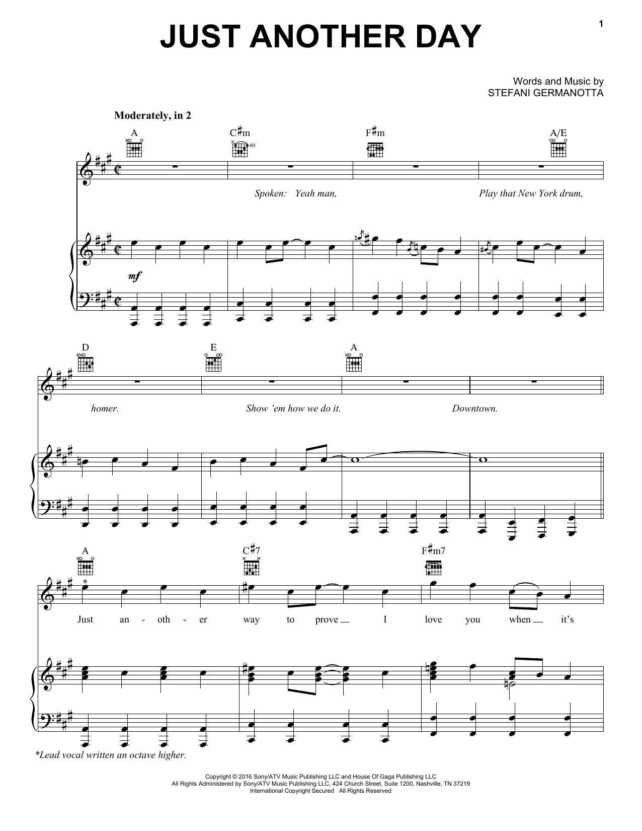 * Please, make sure you check if transposition is possible before your complete your online purchase. You do that by clicking the "notes" icon at the bottom of the interactive viewer. If transposition is available, then various semitones transposition options will appear. If not, the notes icon will remain grayed. Most of our scores are traponsosable, but not all of them.So, check if Lady Gaga Just Another Day Sheet Music is indeed transposable before completing your online purchase!