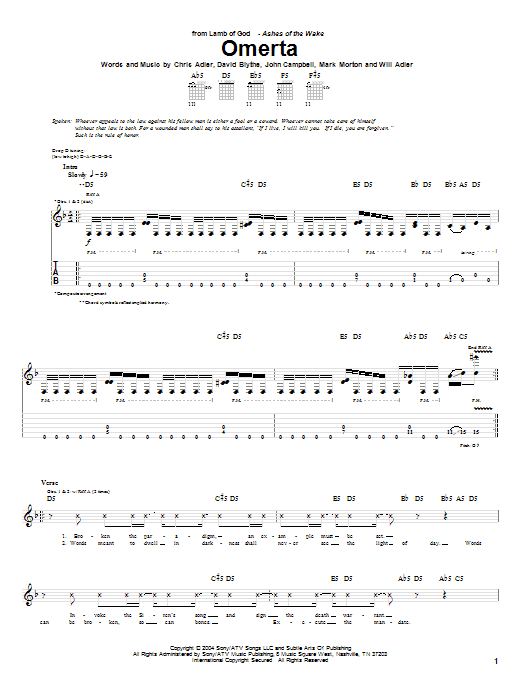 Lamb of God Omerta sheet music, chords, lyrics - Printable PDF for Guitar Tab