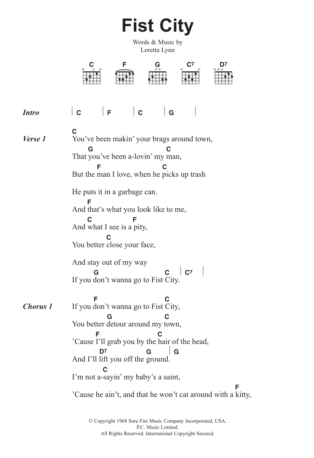 Loretta Lynn Fist City sheet music, chords, lyrics - Printable PDF for Lyrics & Chords