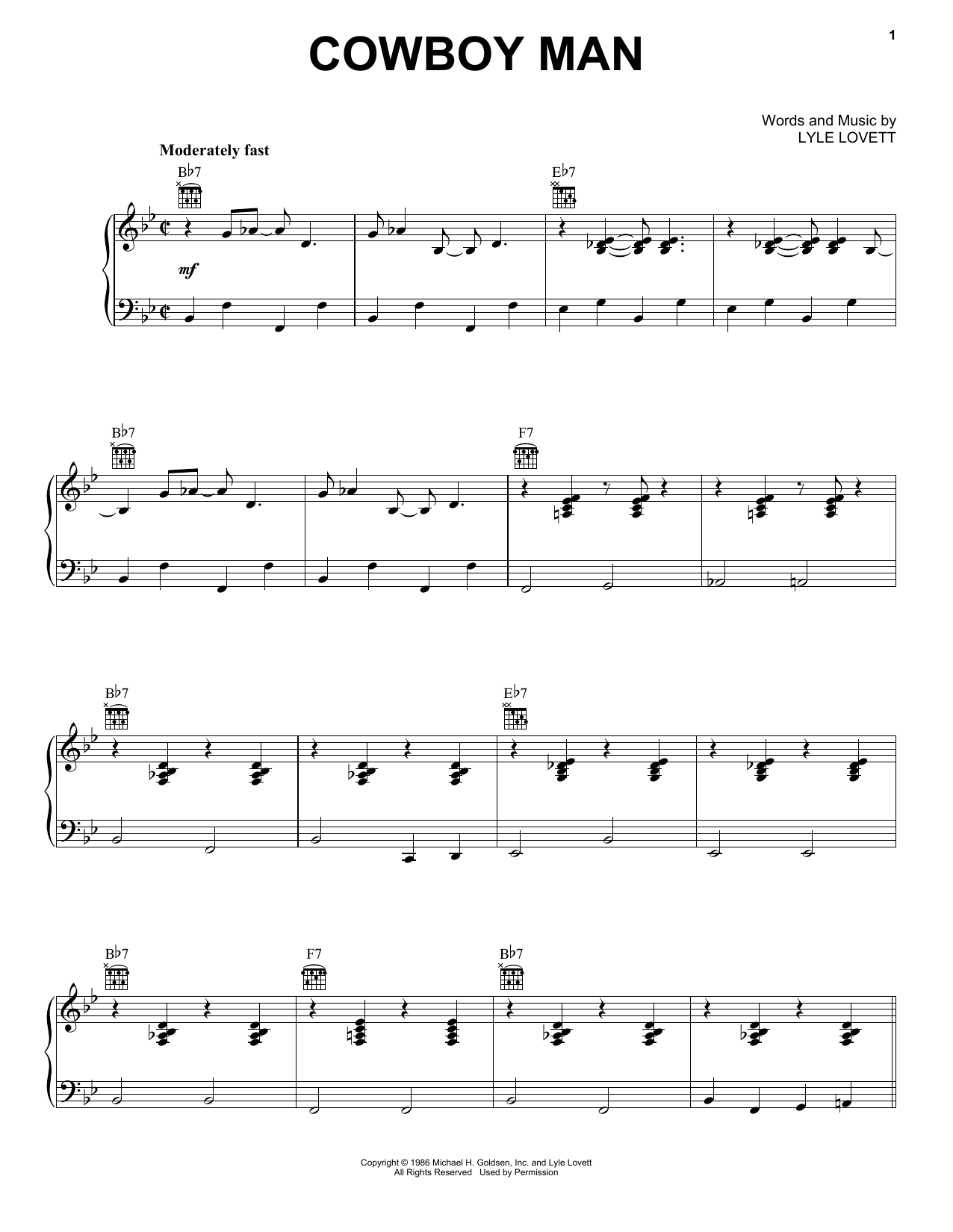 Lyle Lovett Cowboy Man sheet music, chords, lyrics - Printable PDF for Piano, Vocal & Guitar (Right-Hand Melody)