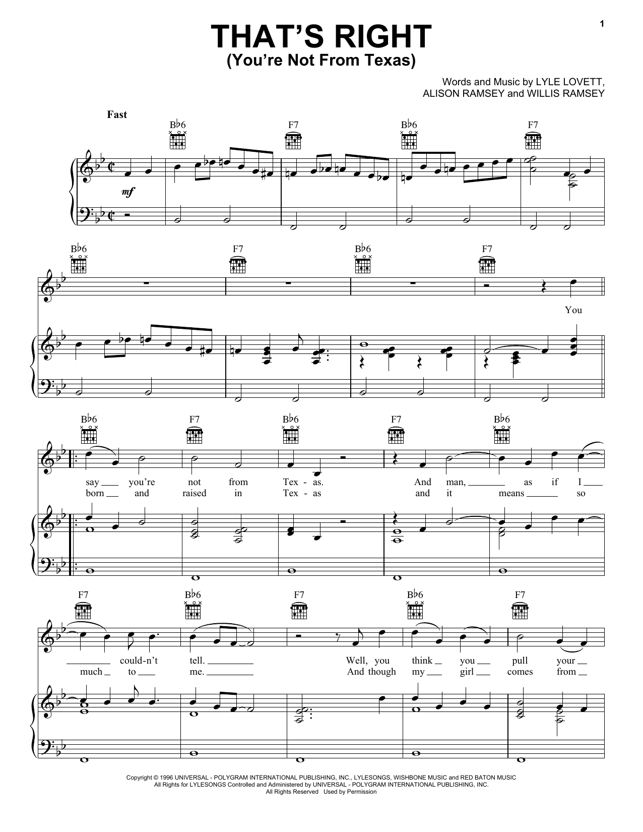Lyle Lovett That's Right (You're Not From Texas) sheet music, chords, lyrics - Printable PDF for Piano, Vocal & Guitar (Right-Hand Melody)
