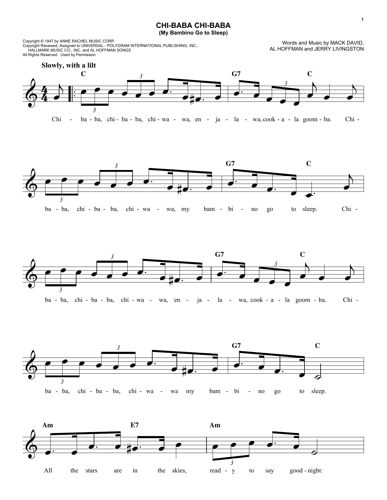 Mack David Chi-Baba Chi-Baba (My Bambino Go To Sleep) sheet music, chords, lyrics - Printable PDF for Melody Line, Lyrics & Chords