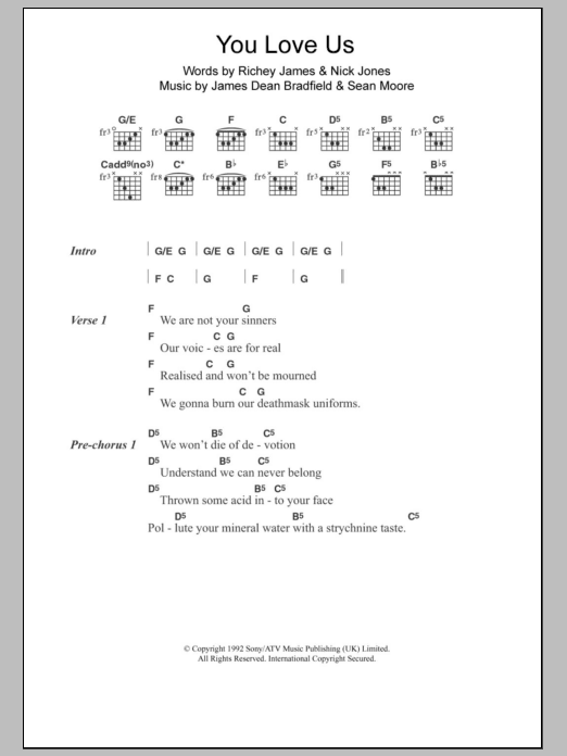 Manic Street Preachers You Love Us sheet music, chords, lyrics - Printable PDF for Lyrics & Chords