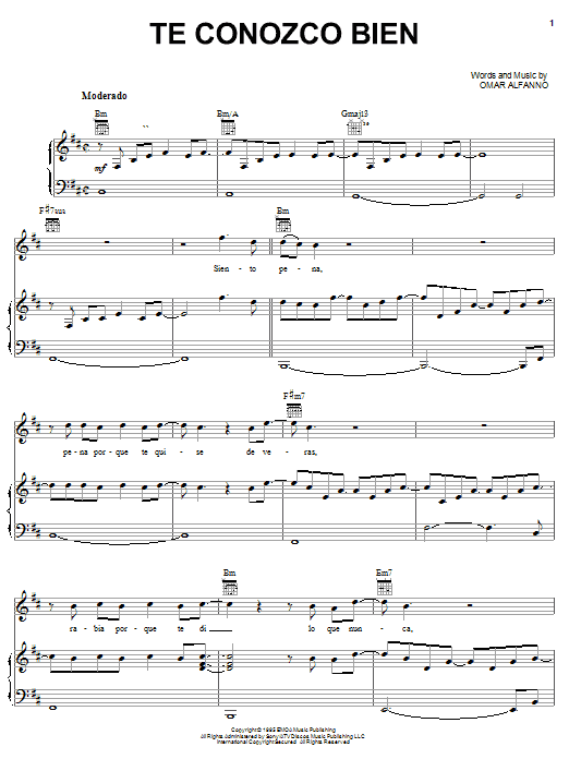 Marc Anthony Te Conozco Bien sheet music, chords, lyrics - Printable PDF for Piano, Vocal & Guitar (Right-Hand Melody)
