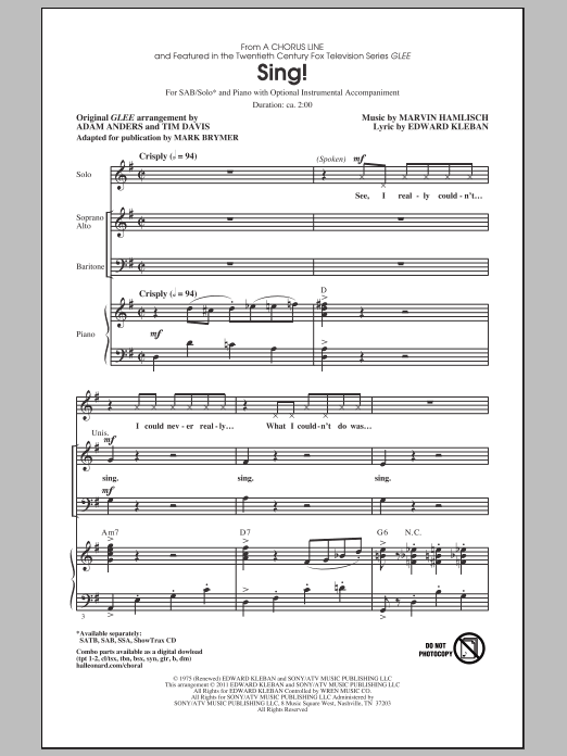 Marvin Hamlisch Sing! (from A Chorus Line) (arr. Mark Brymer) sheet music, chords, lyrics - Printable PDF for SAB