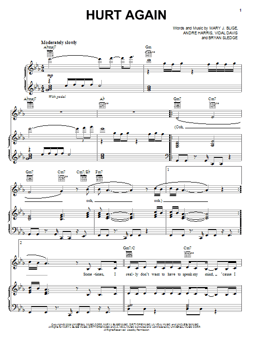 Mary J. Blige Hurt Again sheet music, chords, lyrics - Printable PDF for Piano, Vocal & Guitar (Right-Hand Melody)