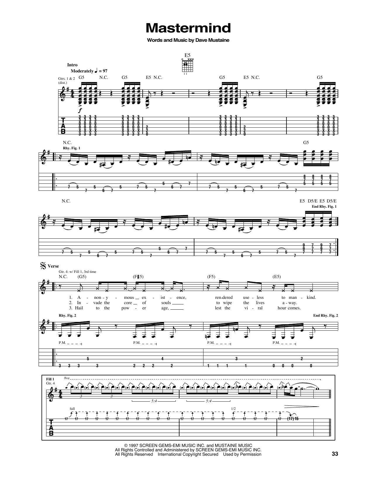 Megadeth Mastermind sheet music, chords, lyrics - Printable PDF for Guitar Tab