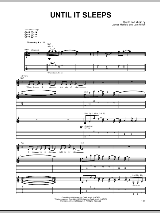 Download Metallica Until It Sleeps (Live S&M version) sheet music and printable PDF notes for Guitar Tab. This score composition includes 12 page(s). It was wonderfuly put together for the style of Metal with catalog SKU number of 73845. Popular song was originally published on 2016-08-11T00:00:00 and was updated on 2023-01-13T00:00:00. The arrangement code for Metallica sheet music is TAB and minimum required purchase quantaty of the digital score is 1. Learn more about Metallica and click here ».