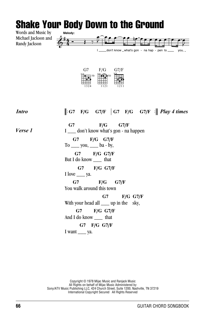 Download Michael Jackson Shake Your Body Down To The Ground sheet music and printable PDF notes for Guitar Chords/Lyrics. This score composition includes 4 page(s). It was wonderfuly put together for the style of Pop with catalog SKU number of 160999. Popular song was originally published on 2015-08-15T00:00:00 and was updated on 2022-09-11T00:00:00. The arrangement code for Michael Jackson sheet music is GTRCHD and minimum required purchase quantaty of the digital score is 1. Learn more about Michael Jackson and click here ».