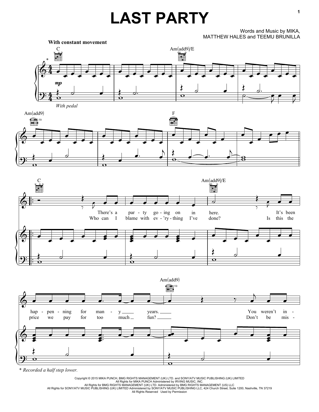 Mika Last Party sheet music, chords, lyrics - Printable PDF for Piano, Vocal & Guitar (Right-Hand Melody)