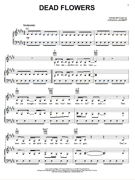 Download Miranda Lambert Dead Flowers sheet music and printable PDF notes for Piano, Vocal & Guitar Chords (Right-Hand Melody). This score composition includes 5 page(s). It was wonderfuly put together for the style of Country with catalog SKU number of 80485. Popular song was originally published on 2011-04-11T00:00:00 and was updated on 2023-01-03T00:00:00. The arrangement code for Miranda Lambert sheet music is PVGRHM and minimum required purchase quantaty of the digital score is 1. Learn more about Miranda Lambert and click here ».