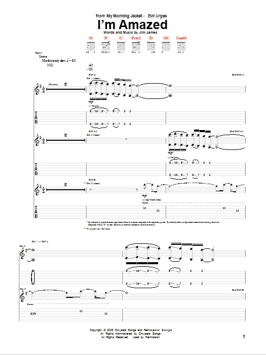 My Morning Jacket I'm Amazed sheet music, chords, lyrics - Printable PDF for Guitar Tab