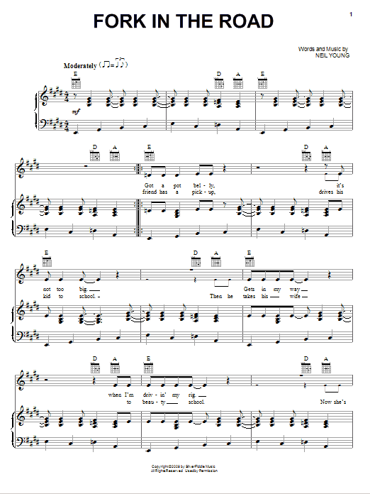 Neil Young Fork In The Road sheet music, chords, lyrics - Printable PDF for Piano, Vocal & Guitar (Right-Hand Melody)