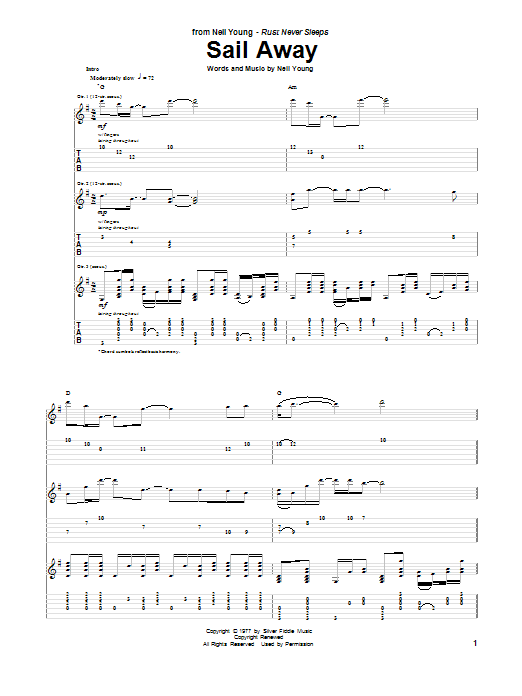 Neil Young Sail Away sheet music, chords, lyrics - Printable PDF for Guitar Tab